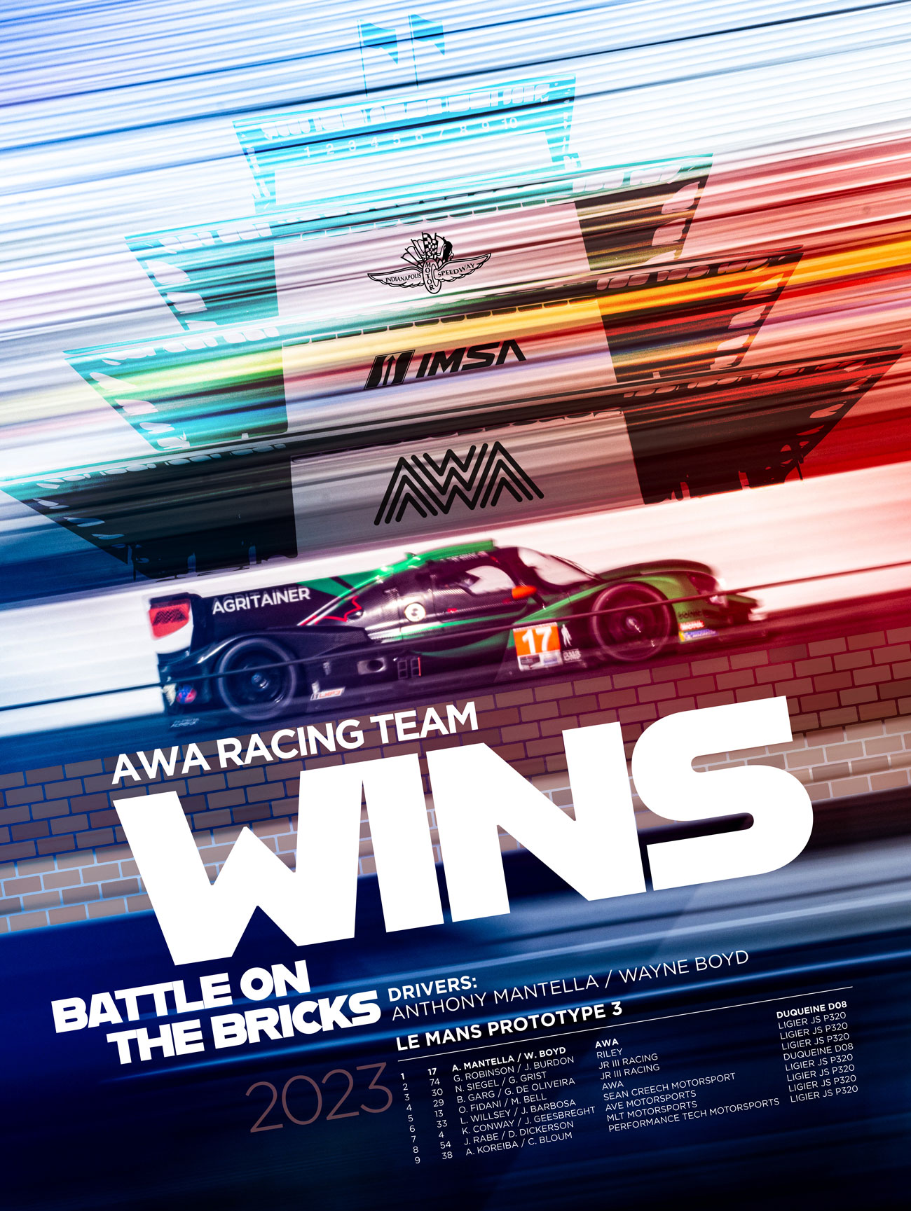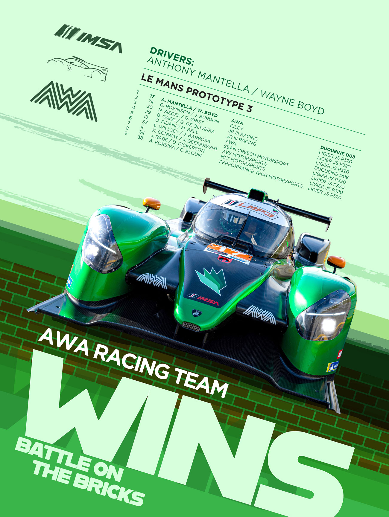 In 2021 the AWA team in partnership with ORLando Corp. moved from driving a Mclaren to a new Duqueine D-08 prototype car. I have the pleasure to create a livery for the two new cars that the team was running in different divisions of the IMSA prototype car division for the 2022 season. One of the cars was under the ORLANDO corp banner and the other one was under the AGRITAINER/Mantella Corp.