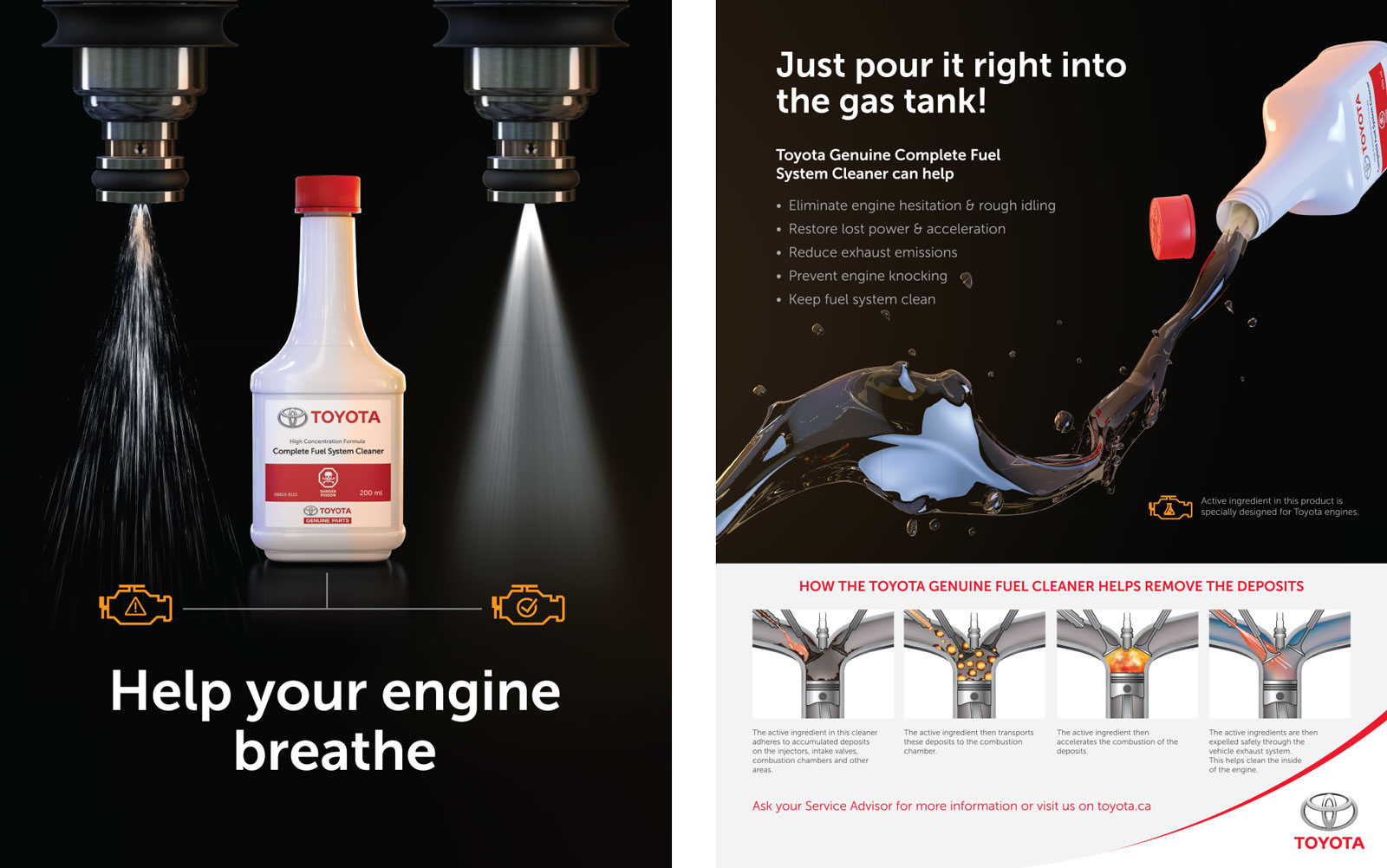 When it was time to launch the new Fuel System Cleaner product from Toyota. I was contacted to come up with a double page artwork that clearly illustrate the product, its use and how it works. Instead of using photography I opted to use 3D to show a more dynamic shot of the product. This definitely was the way to go as they wanted a close-up of the Fuel Injector after and before using the product.