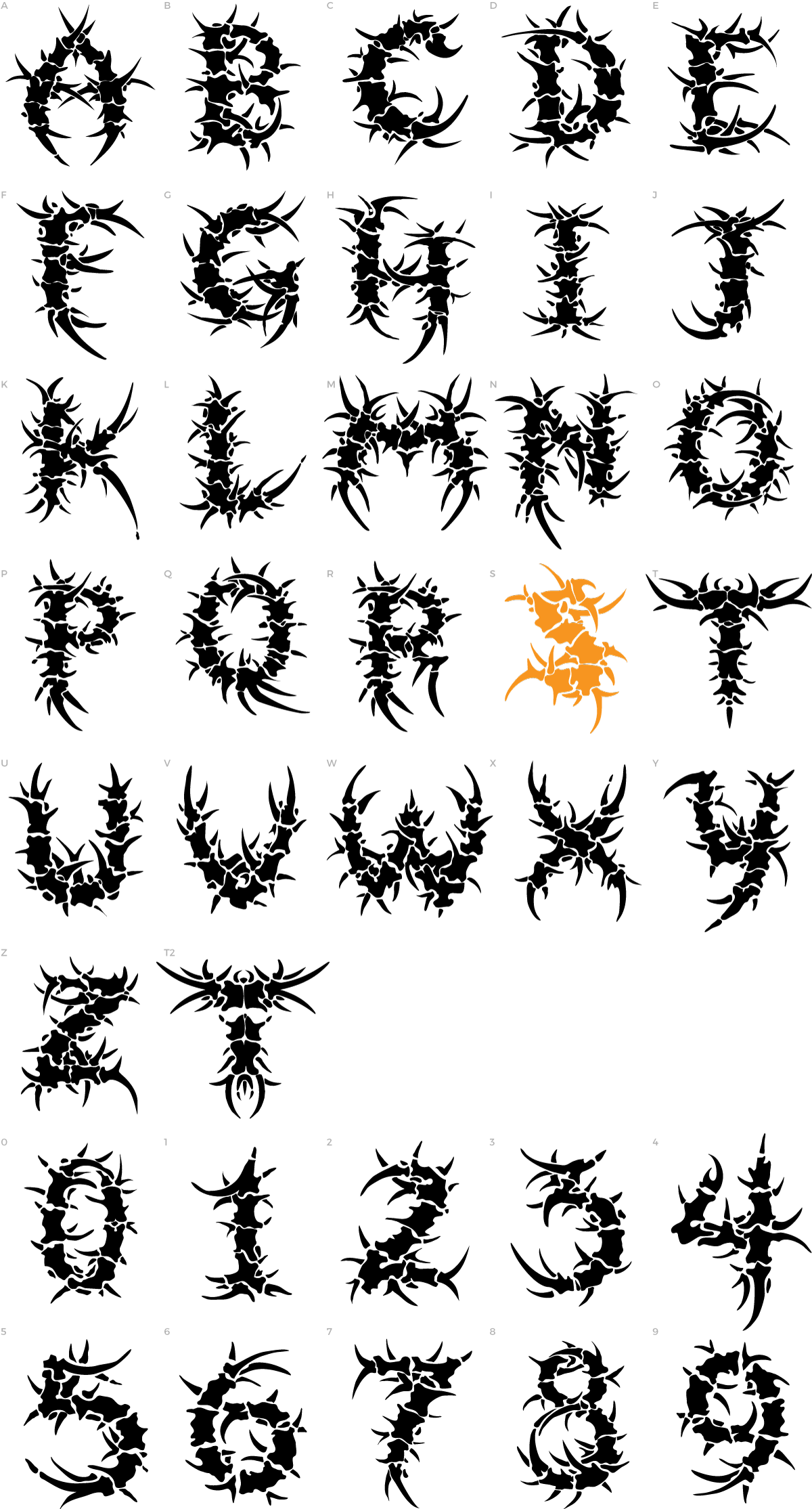 Included in the font file I added some bonus glyphs of some future variants of the font. Sepulutura has a bunch of albums and I can not stop wondering how an alphabet will look with the theme of some of the albums. If you feel generous, I would appreciate it if you help with a small donation for some caffeine intake in aiding the development of the sepulcra font variants.