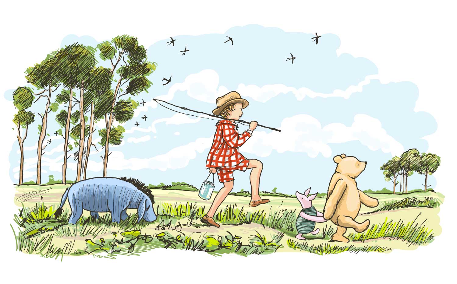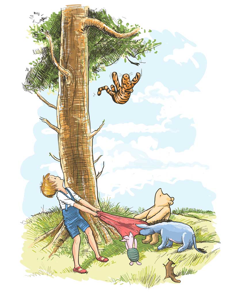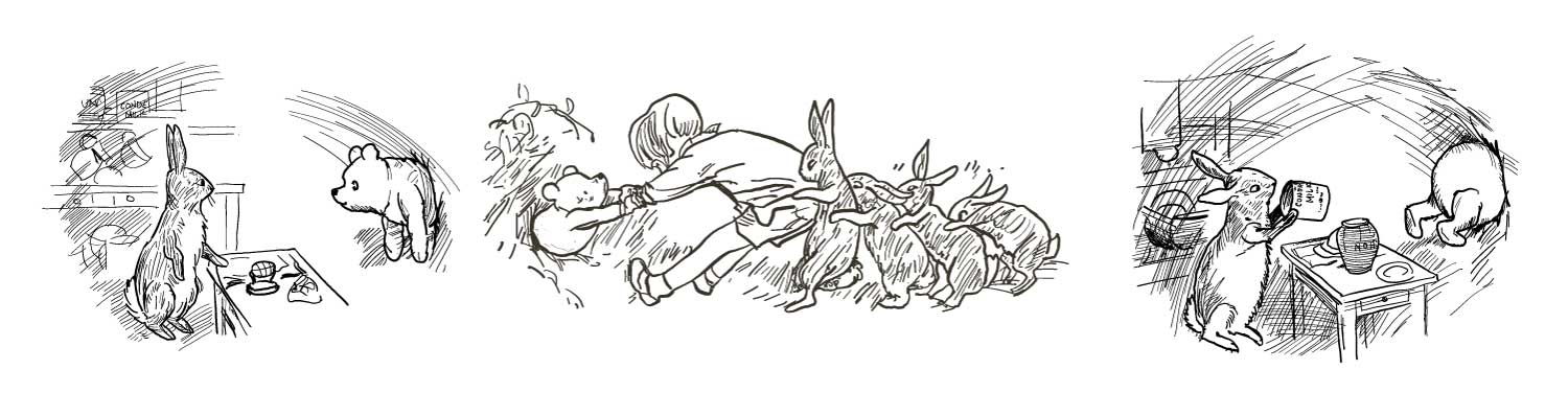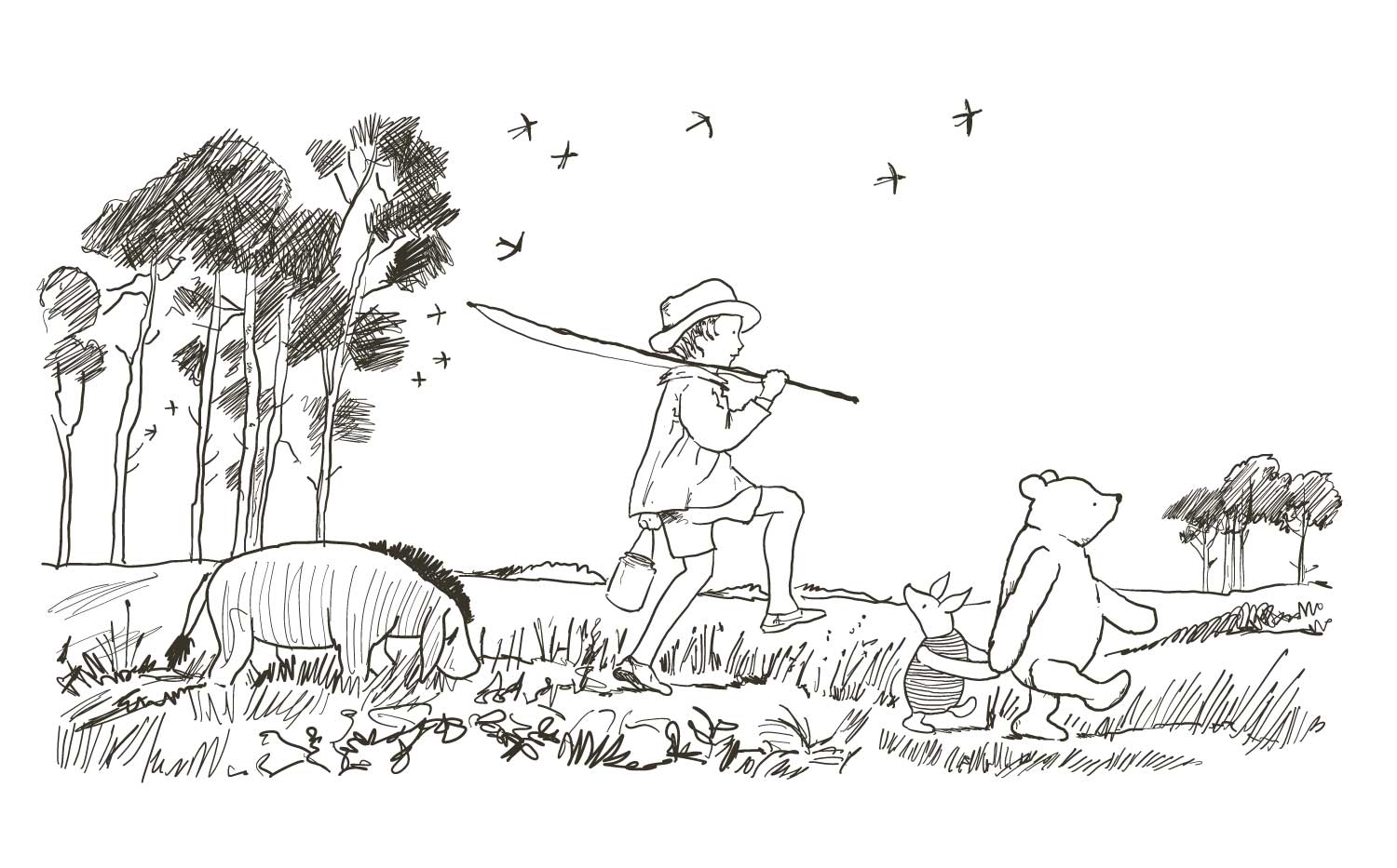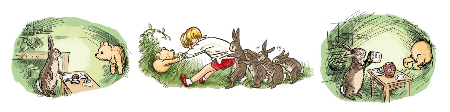 A friend asked me to recreate some vintage Winnie the Pooh illustrations for a personal project. I was familiar with the Disney version of Winnie the Pooh, but I was amazed by the line work of the original illustrator, Ernest Howard Shepard. I was hooked. I tried to recreate his masterful inking and added some coloring that complements his inking style while being all the time in vector form.