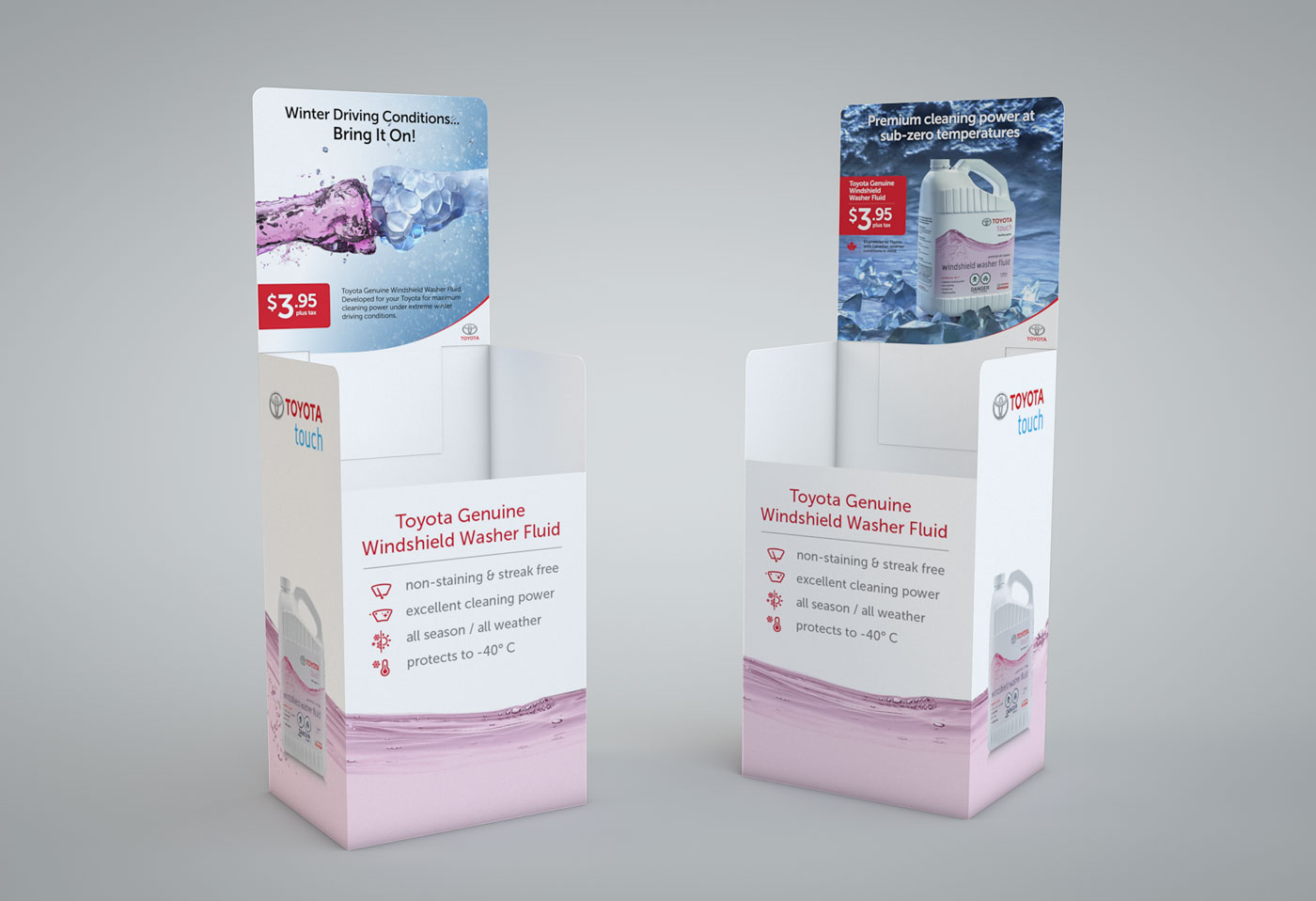 An artwork was commissioned for the Toyota Genuine Washer Fluid for the winter promotion. A couple of drafts were produced. Below you will find some of the images I created for the final creative.